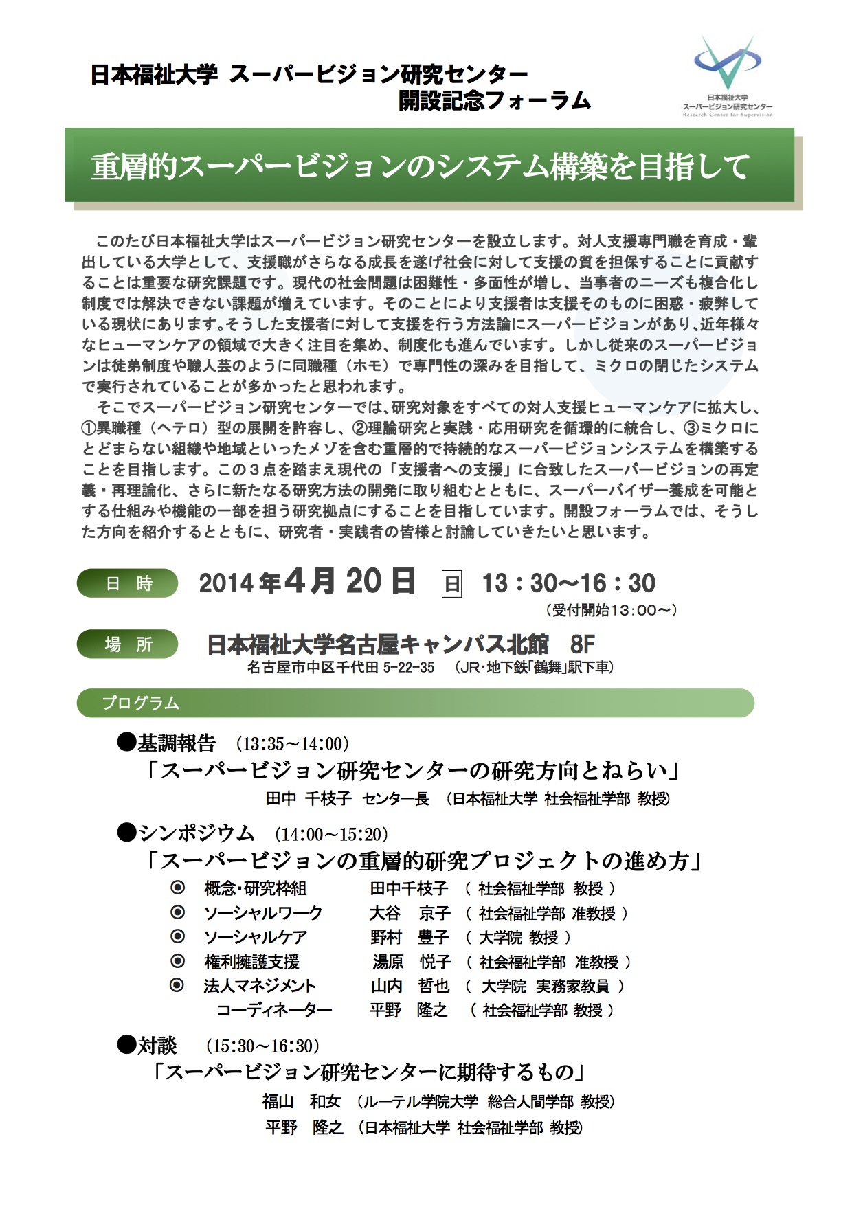 日本福祉大学 スーパービジョン研究 センター開設記念フォーラム 重層的スーパービジョンのシステム構築を目指して 2014年03月16日 16:46 http://www.n-fukushi.ac.jp/kenkyu/symposium/supervision/2/index.html 「お知らせ」カテゴリの最新記事 タグ :#愛知県#名古屋市 < 前の記事次の記事 > コメント コメントフォーム 名前 コメント 評価する リセット リセット 顔 星 投稿する 情報を記憶